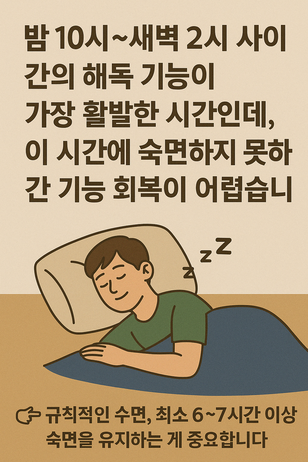 밤 10시~새벽 2시 사이 간의 해독 기능이 가장 활발한 시간인데, 이 시간에 숙면하지 못하면