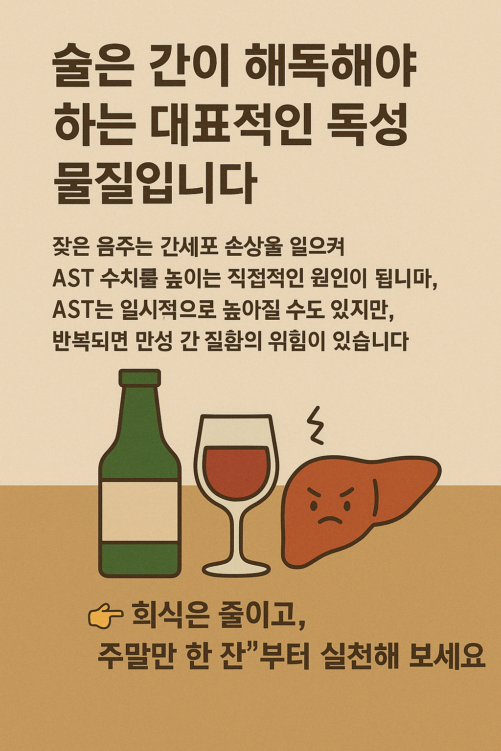 잦은 음주는 간세포 손상을 일으켜 AST 수치를 높이는 직접적인 원인이 됩니다.