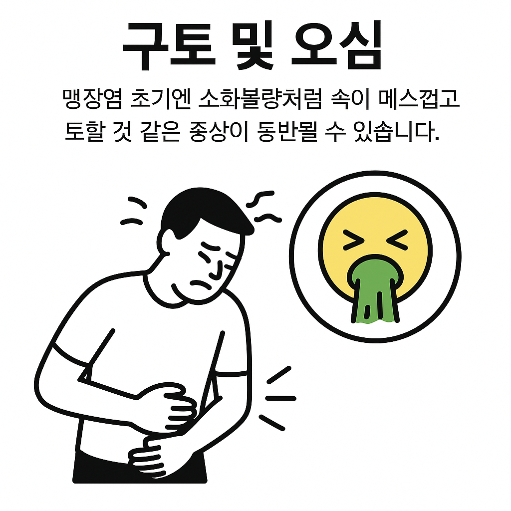 맹장염 초기엔 소화불량처럼 속이 메스껍고 토할 것 같은 증상이 동반될 수 있습니다.