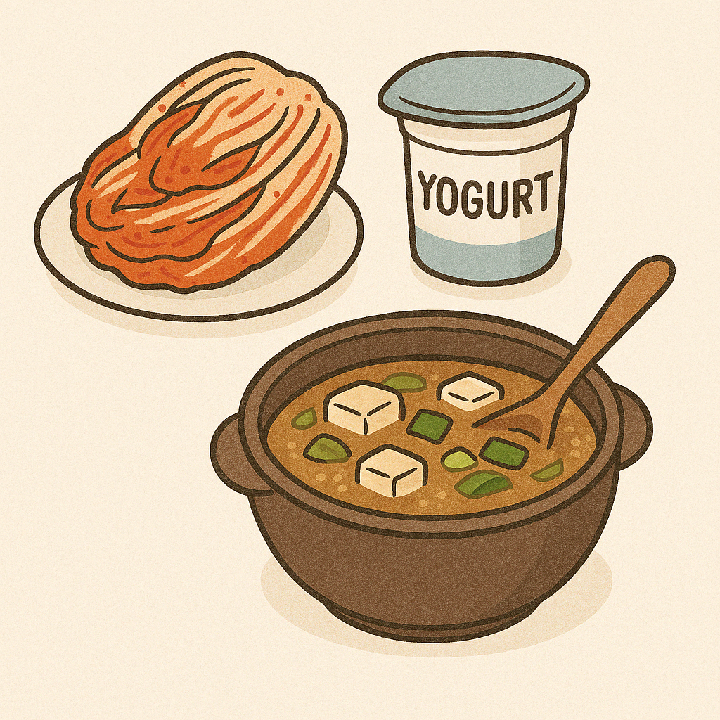 유산균 식품 김치, 요구르트, 된장국 프로바이오틱스가 풍부해 장 건강에 도움