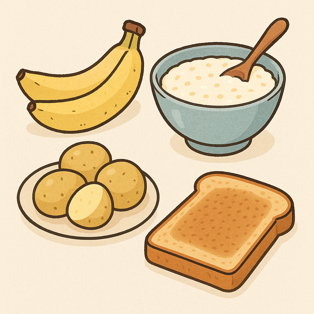 좋은 음식 바나나, 쌀죽, 삶은 감자, 토스트 수분 유지 + 장에 자극이 적고 소화가 쉬움