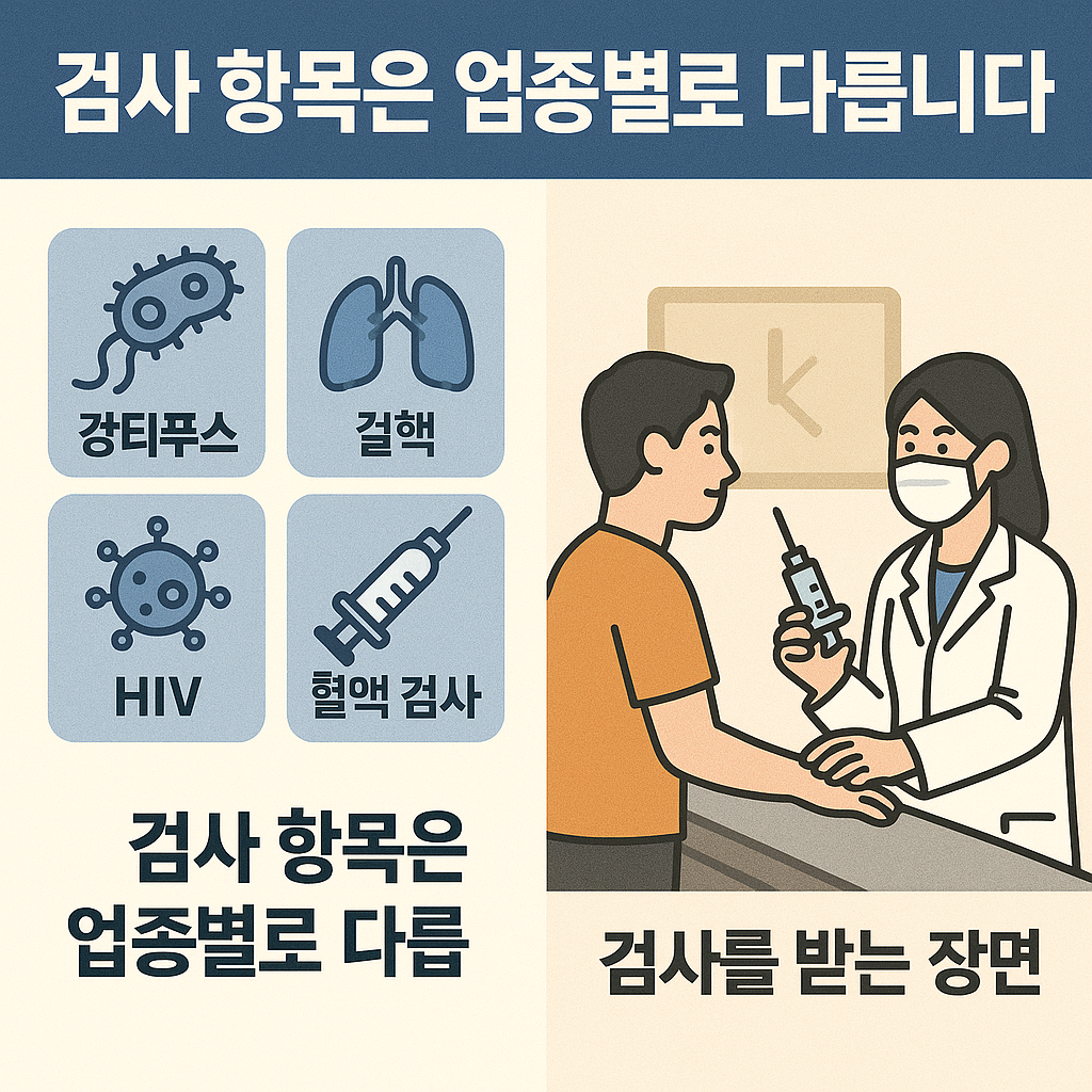 업종별로 요구되는 검사 항목은 달라지며, 검사 항목은 해당 업종의 감염 위험도에 따라 결정됩니다.