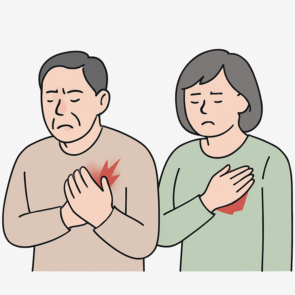 - 심장질환은 왼쪽 가슴 깊숙한 곳의 압박감, 팔·턱으로 퍼지는 통증이 대표적입니다.