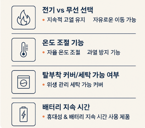 - 전기 vs 무선: 전기는 강한 열감, 무선은 이동성 중시