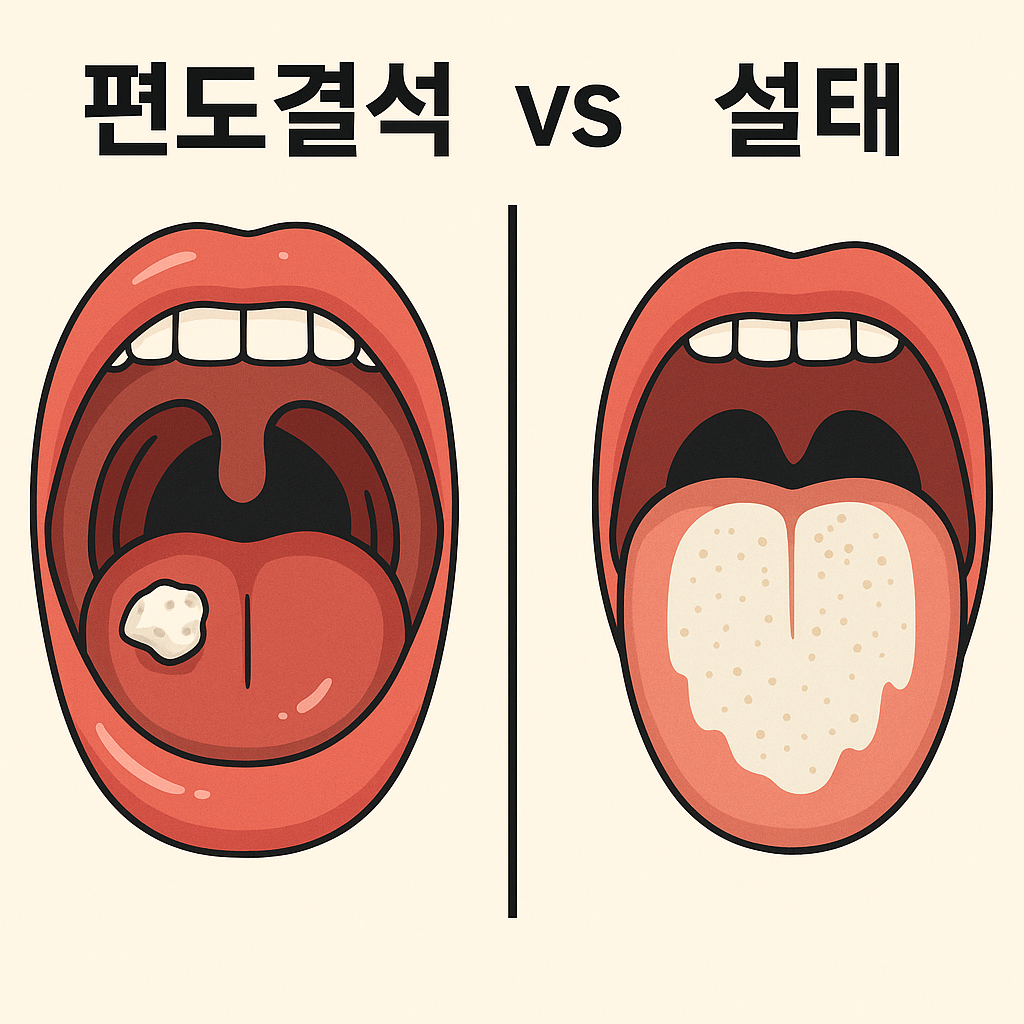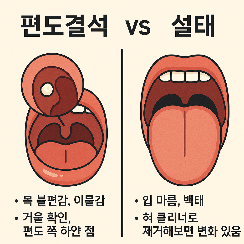 👉 설태는 혀 표면에 쌓인 백태로 제거 가능하지만, 편도결석은 목구멍 안쪽 편도에 생긴 돌입니다.